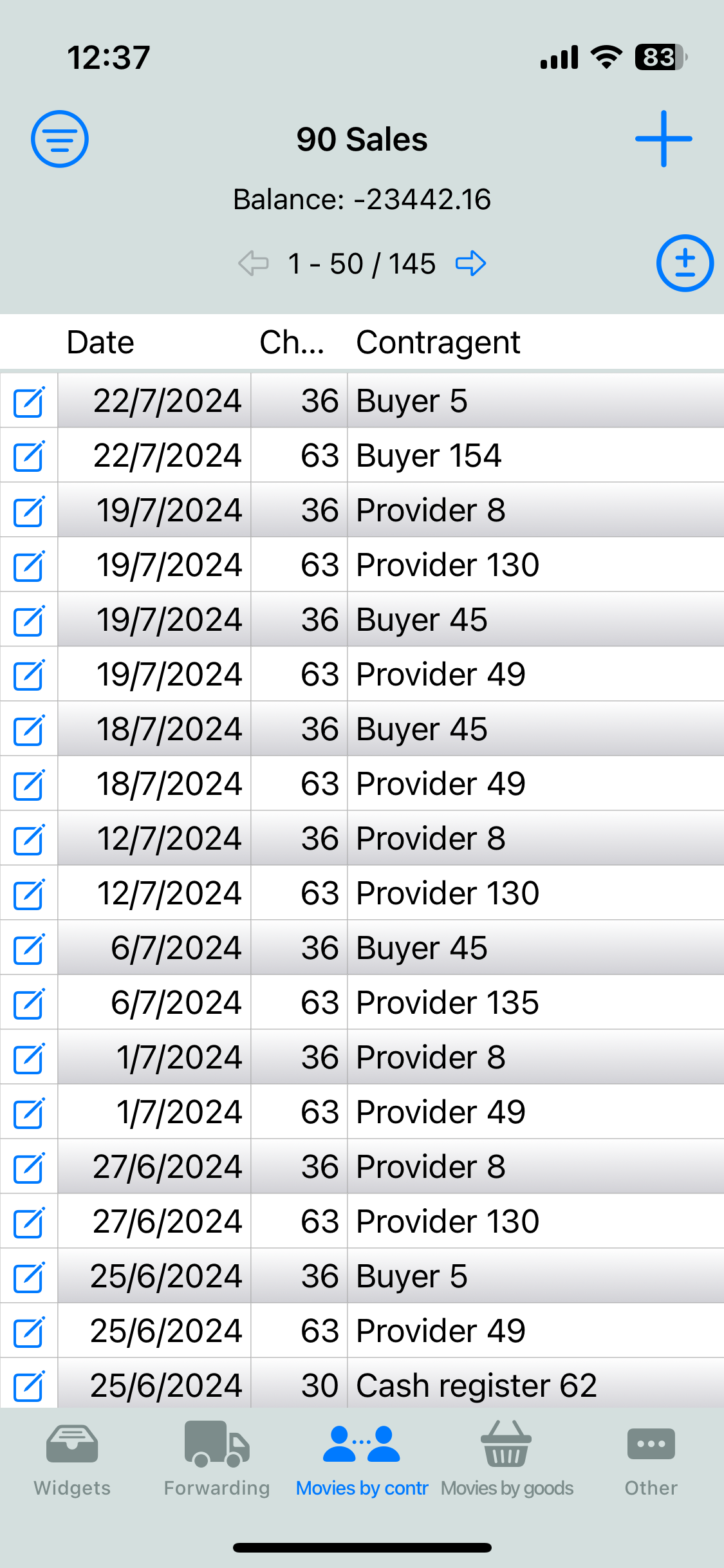 Основной раздел материального учета. Для начала нужно выбрать "Contragent" ("Chart" и "Currency" опционально) по которому будут видны все его проводки, сразу будет виден баланс по этому контрагенту на текущую дату. После этго можно создавать или редактировать проводки с этим контрагентом.